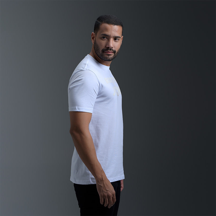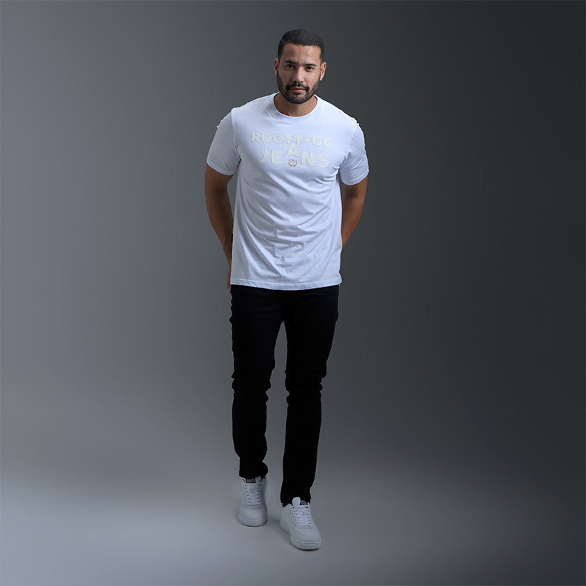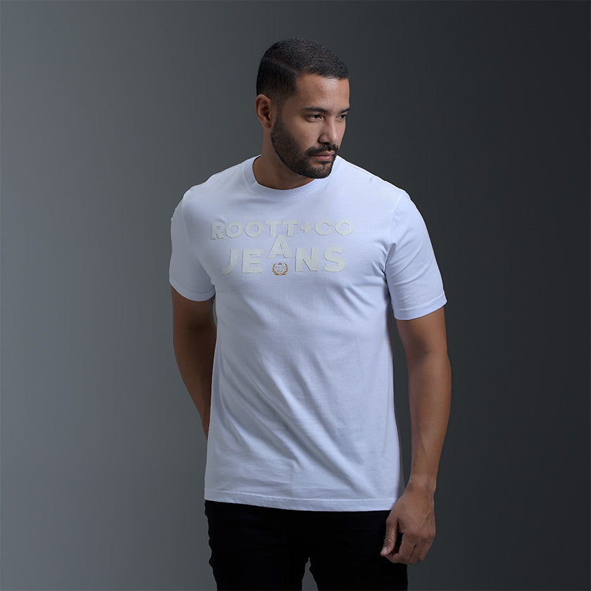 Camiseta para hombre. Presenta gráficos ROOTT+CO en la parte delantera, diseño en mangas y marquillas de la marca ROOTT+CO.