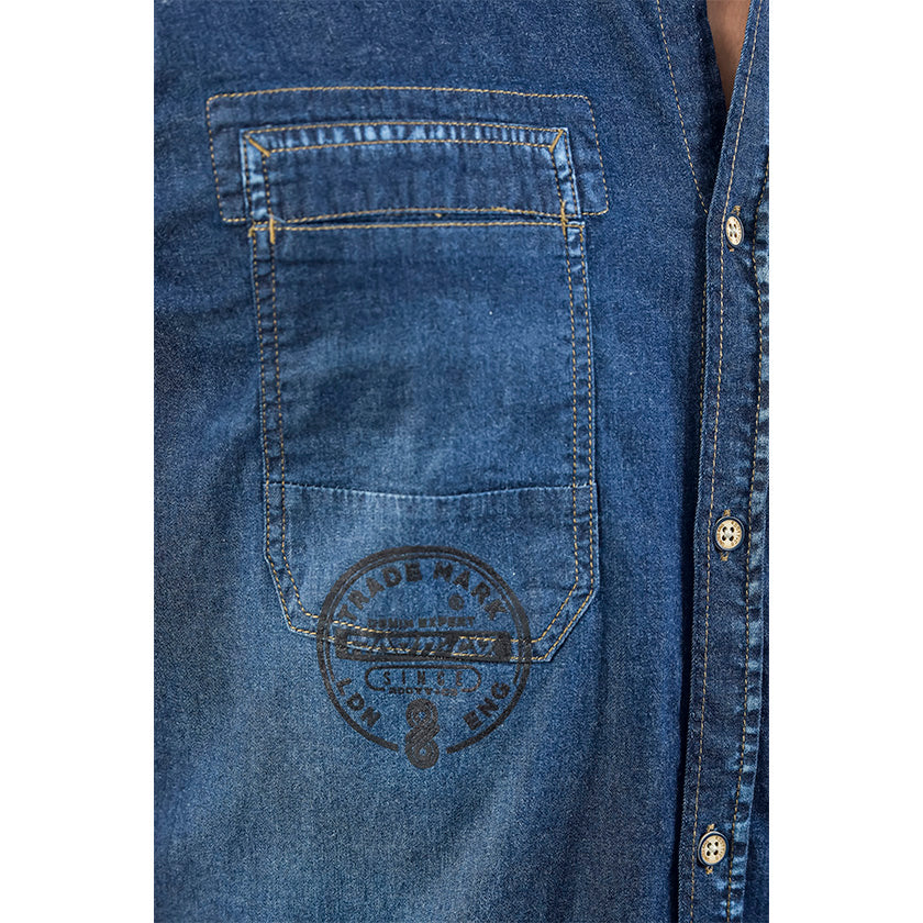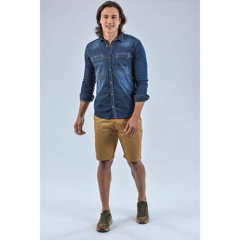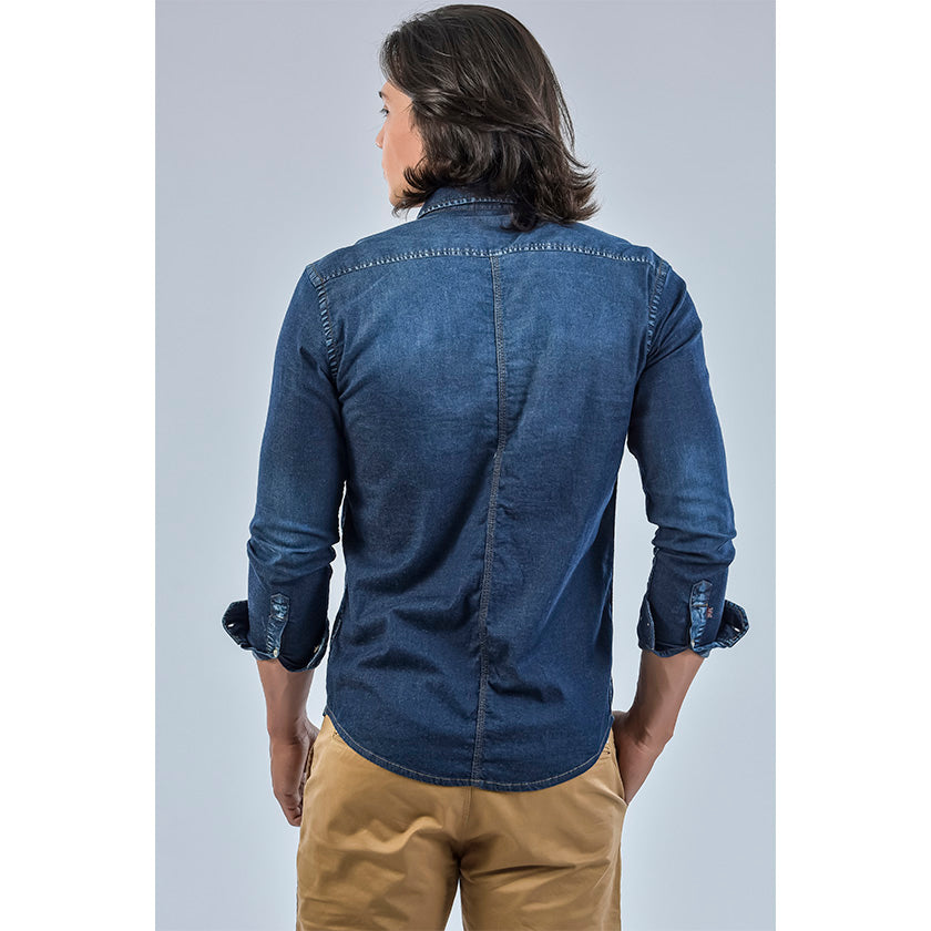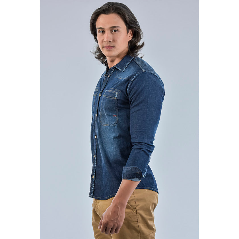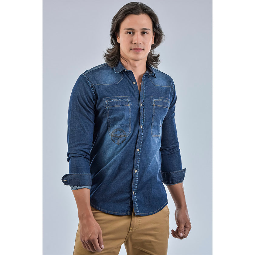 Camisa manga larga denim para hombre luce bolsillos en el pecho y marquilla ROOTT+CO en el inferior de la prenda.