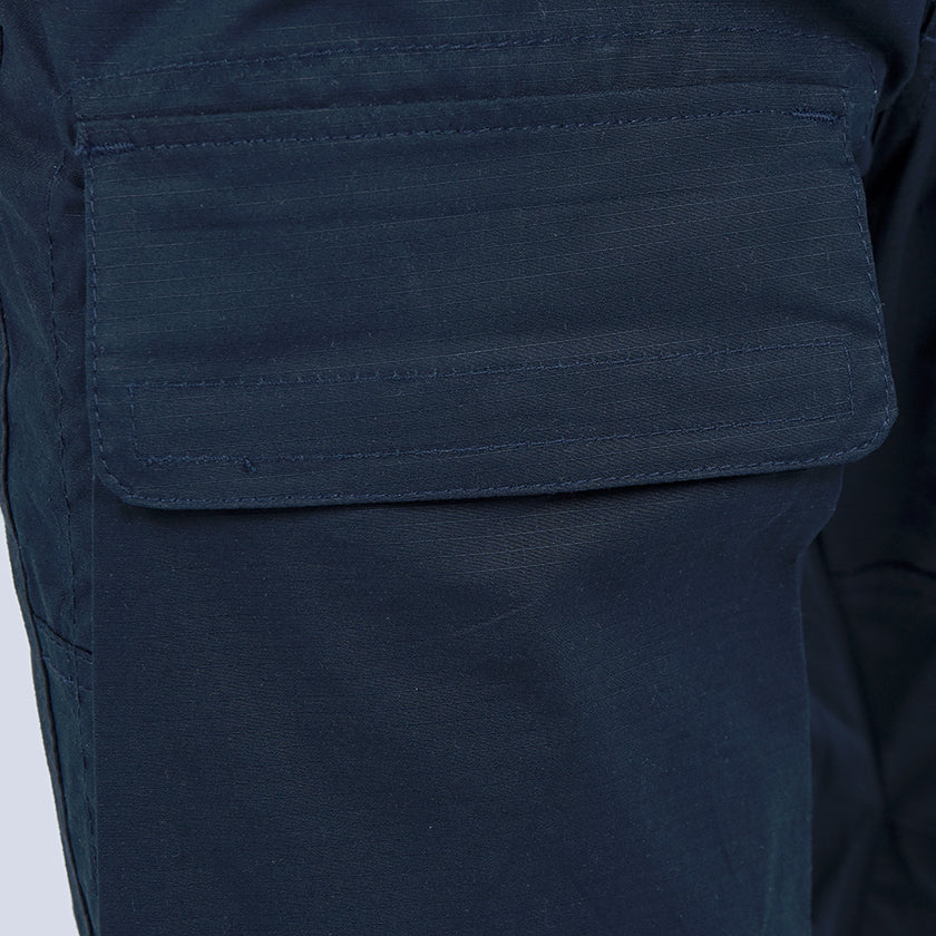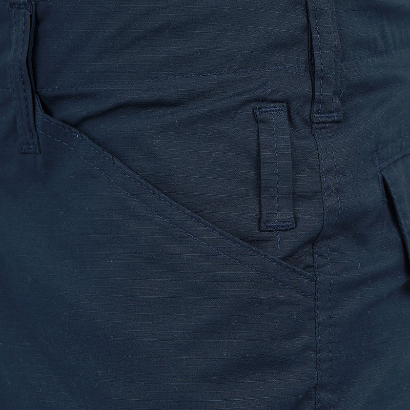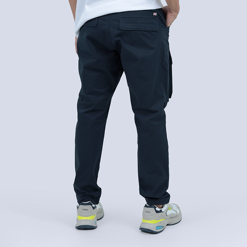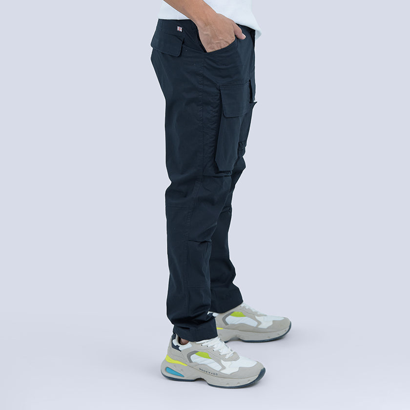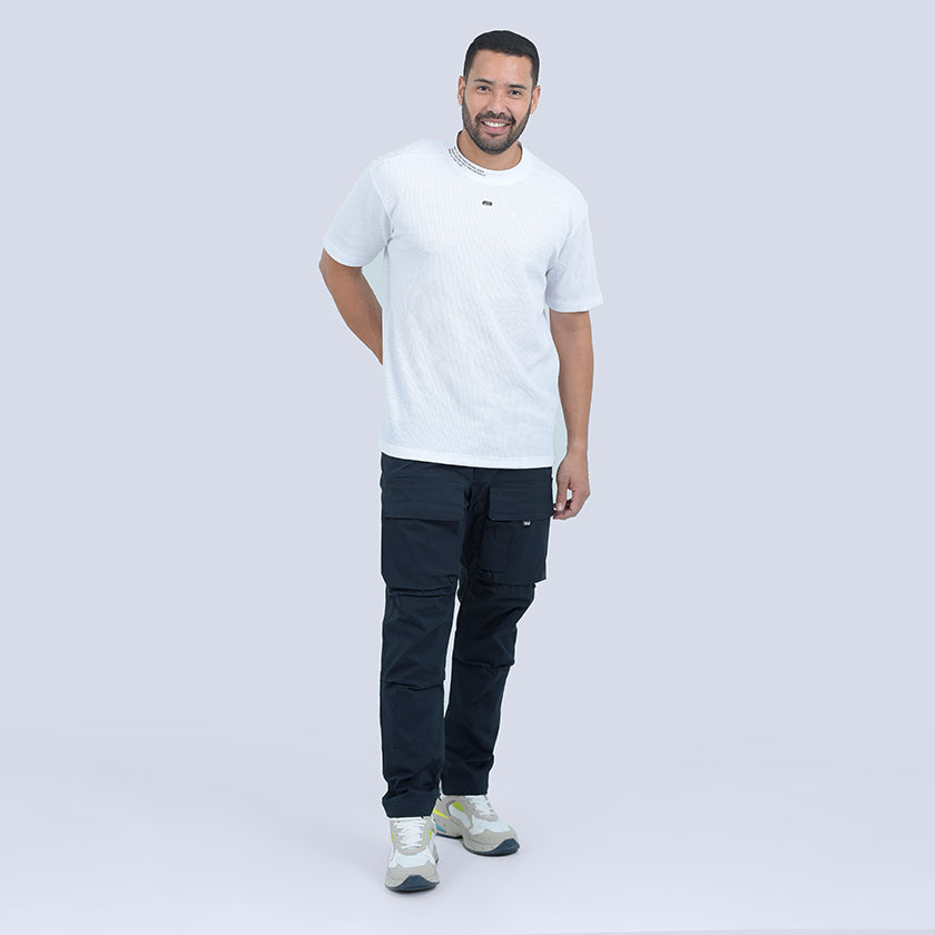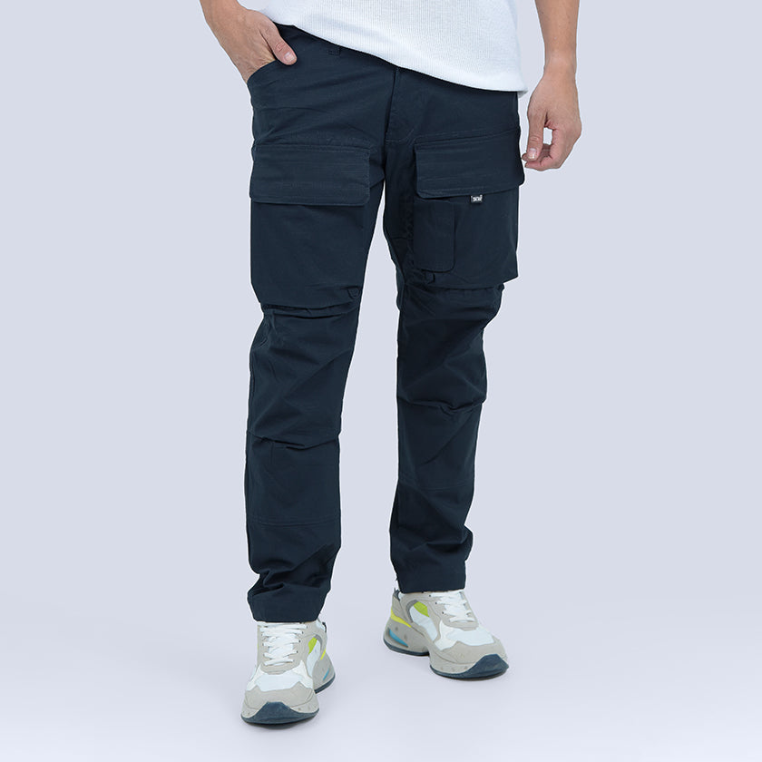 Pantalón cargo para hombre, una prenda clásica llevada a un estilo moderno. Presenta cortes, repises y bolsillos en los muslos que generan contraste con la prenda, además de lucir marquilla con código en uno de sus bolsillos. Cuenta con botas con ajuste elástico en los tobillos y cintura rematada con cordón regulable.