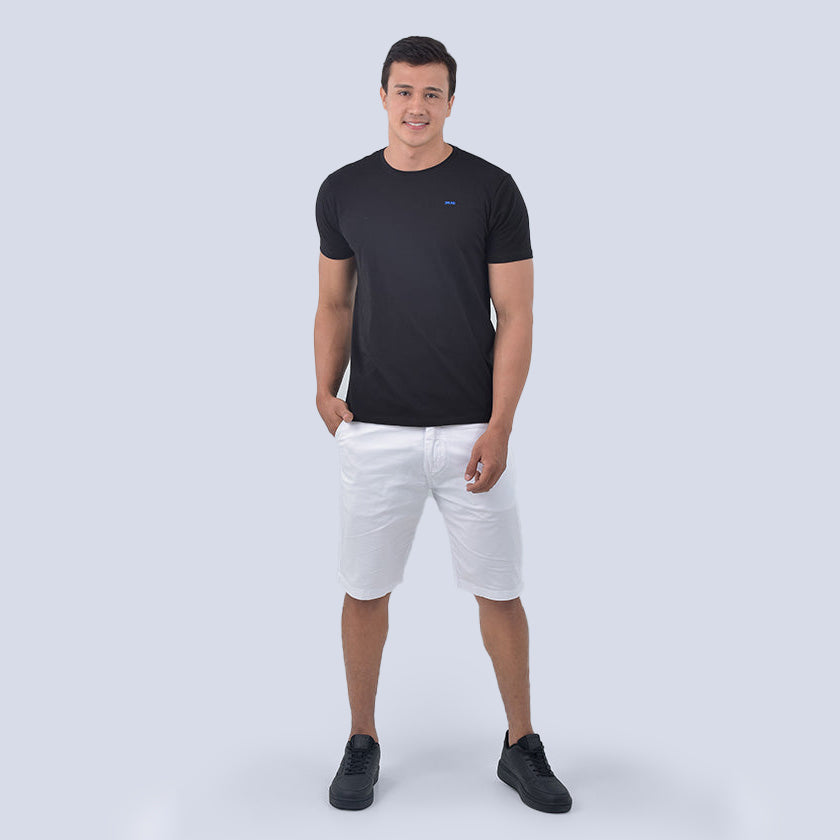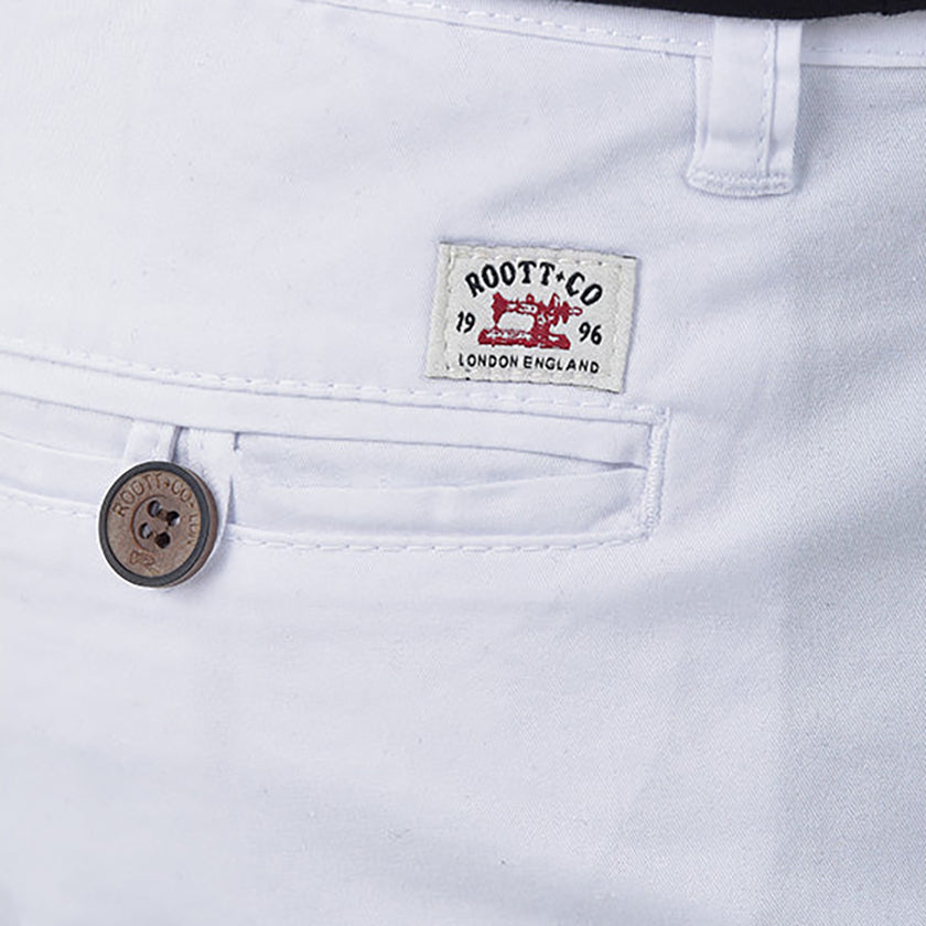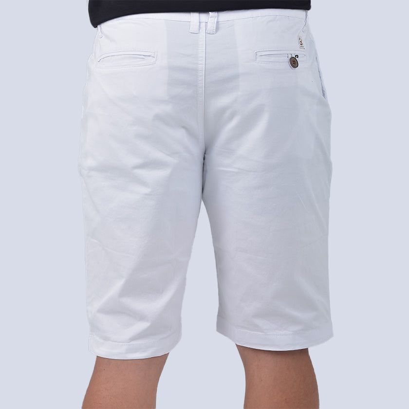 Bermuda para hombre presenta marquilla ROOTT+CO en el bolsillo trasero junto con botón, cómoda ligeramente arriba de la rodilla.