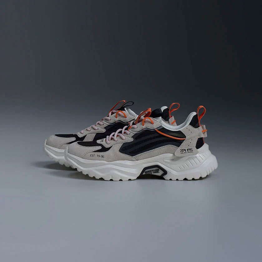Estos tenis combinan la estética "chunky" o dad shoe con un diseño moderno y detalles de alto contraste, ideales para quienes buscan una prenda audaz y vanguardista. Su silueta robusta se construye sobre una suela oversize dentada que proporciona una tracción superior y un look imponente. La capellada mezcla texturas de suede en tono beige o arena con paneles de malla en negro y vibrantes acentos en naranja neón, asegurando transpirabilidad y un estilo streetwear inconfundible. Son el calzado perfecto para inyectar personalidad a cualquier outfit casual, urbano o deportivo.
