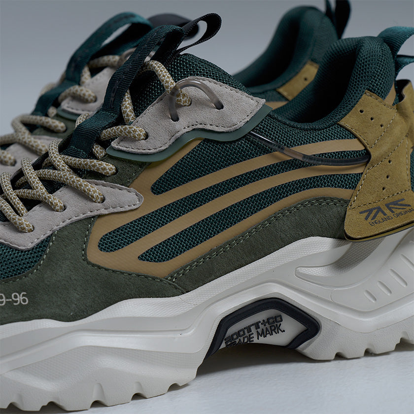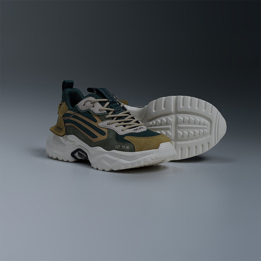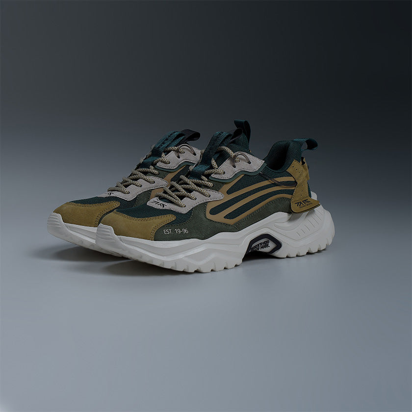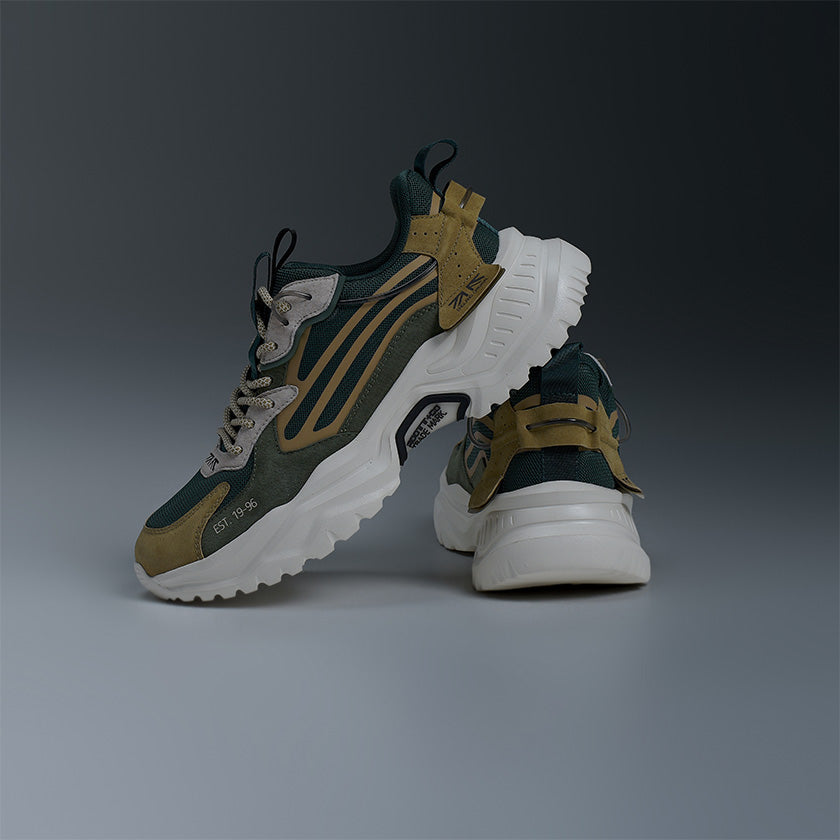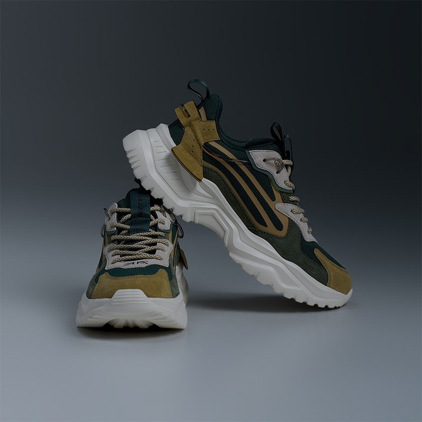 Estos tenis combinan la estética "chunky" o dad shoe con un diseño moderno y detalles de alto contraste, ideales para quienes buscan una prenda audaz y vanguardista. Su silueta robusta se construye sobre una suela oversize dentada que proporciona una tracción superior y un look imponente. La capellada mezcla texturas de suede y gamusa en tono beige y verde con paneles de malla en verde oscuro y lineas en cuero , asegurando transpirabilidad y un estilo streetwear inconfundible. Son el calzado perfecto para inyectar personalidad a cualquier outfit casual, urbano o deportivo.
