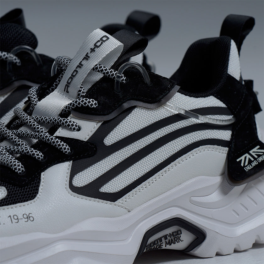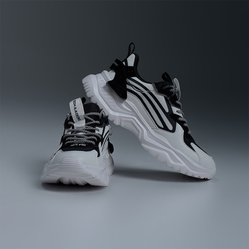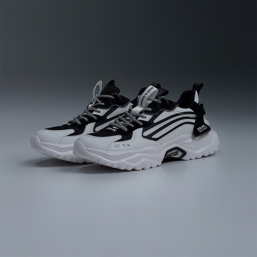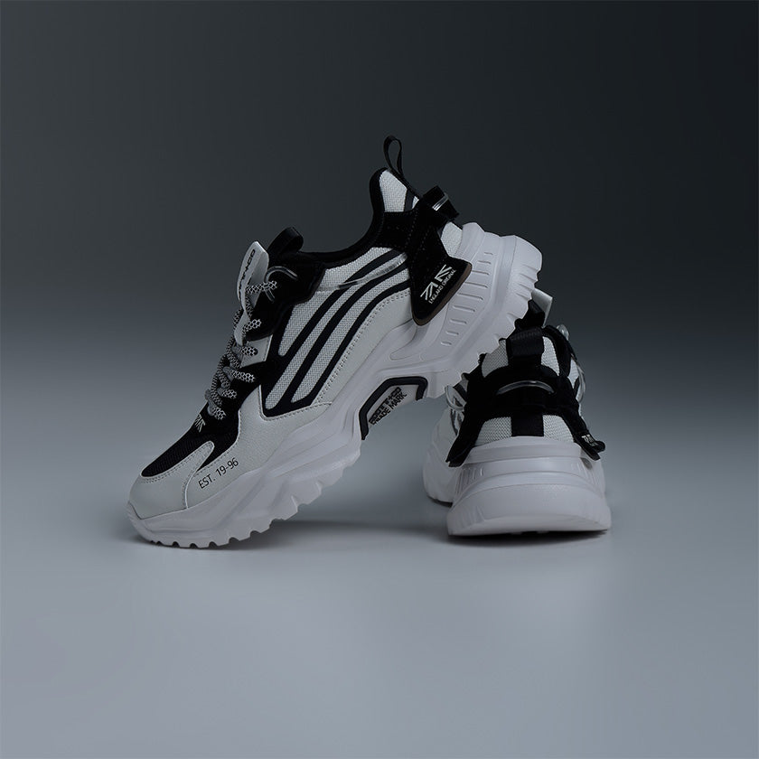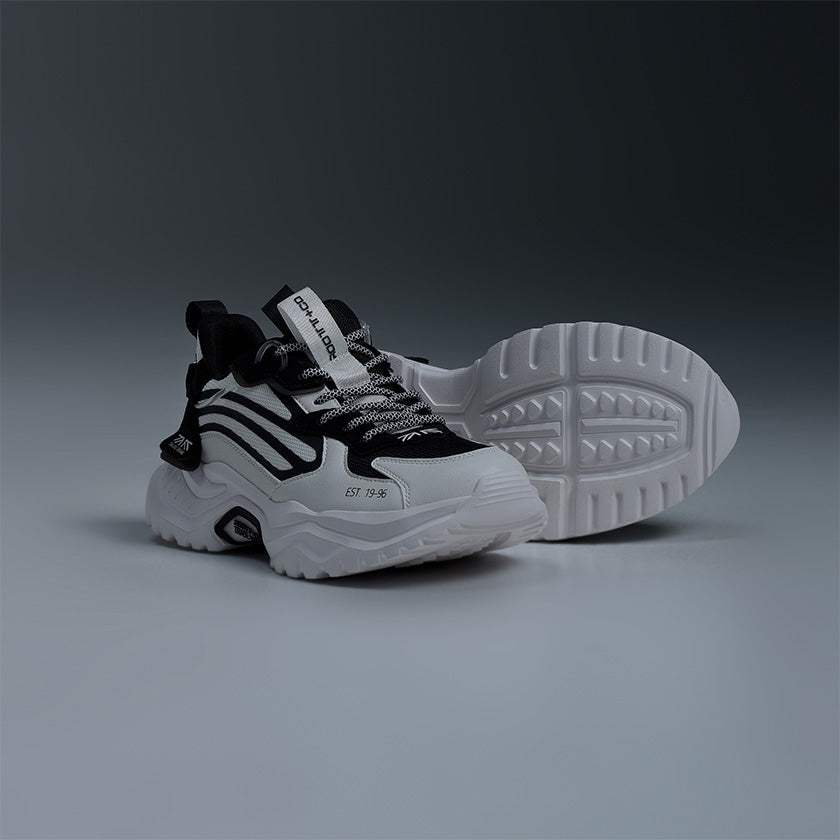 combinación clásica y contrastante de blanco y negro, enmarcada en una silueta chunky de inspiración retro. Son perfectos para quienes buscan un calzado que combine la audacia del streetwear con la versatilidad de un diseño atemporal. Su estructura robusta se asienta sobre una suela oversize, que no solo aporta altura y amortiguación, sino también una tracción superior. La capellada mezcla paneles de cuero sintético liso en blanco con detalles de malla y gamuza negra, creando un juego de texturas dinámico que eleva cualquier look urbano.