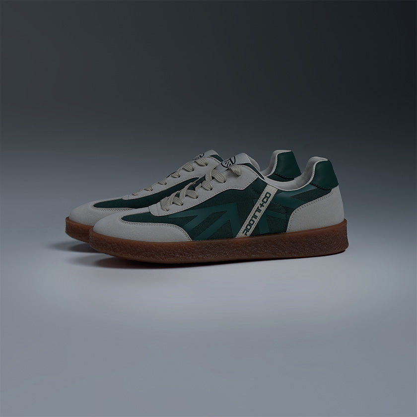 Estos tenis ofrecen una silueta clásica y atemporal con un enfoque minimalista que combina confort y estilo vintage de manera impecable. Su diseño de corte bajo es versátil y fácil de combinar, siendo ideal para elevar cualquier outfit casual, desde jeans hasta pantalones chinos. La capellada juega con el contraste de texturas, utilizando paneles de cuero sintético en tono verde bosque y secciones de gamuza (suede) en tono crema o gris claro, que evocan la estética deportiva de los años 70 y 80. La suela de goma color caramelo (goma natural) no solo proporciona un agarre excelente, sino que sella el look retro que distingue a este calzado.