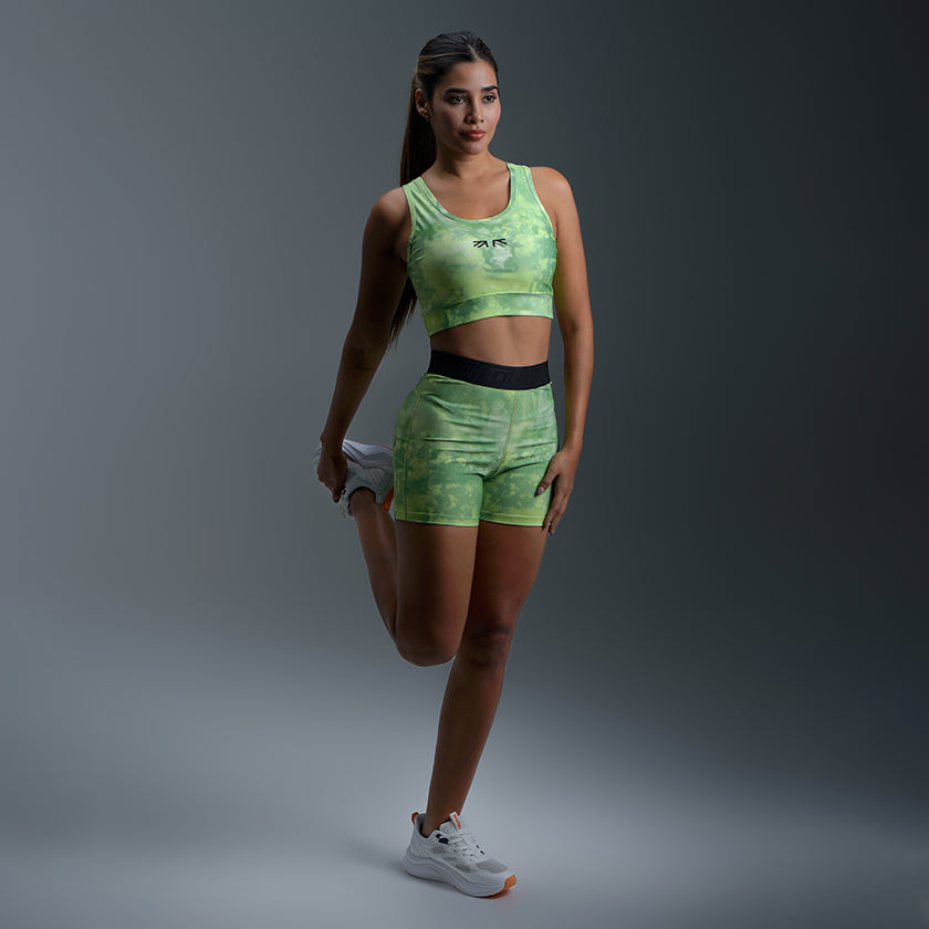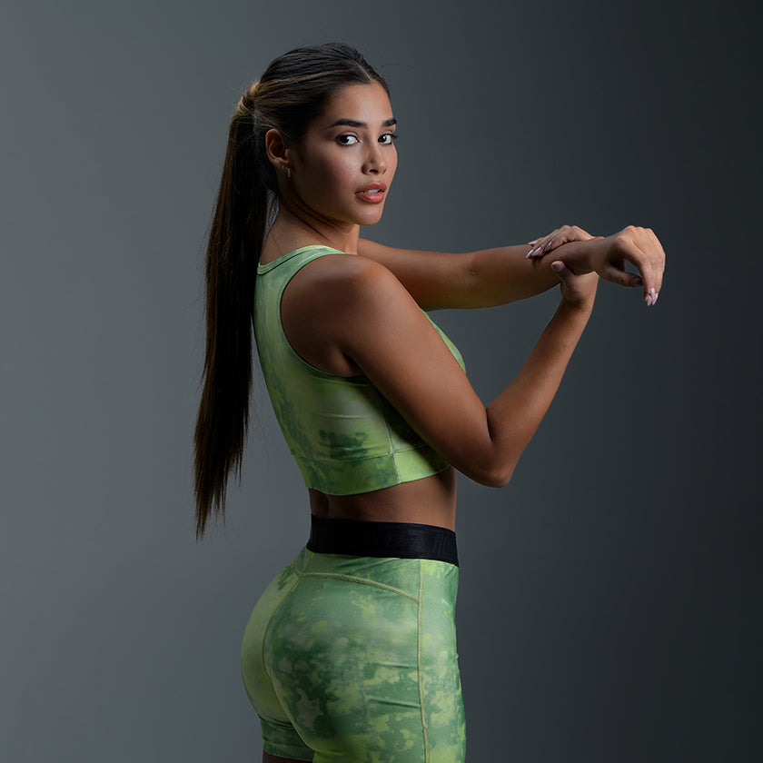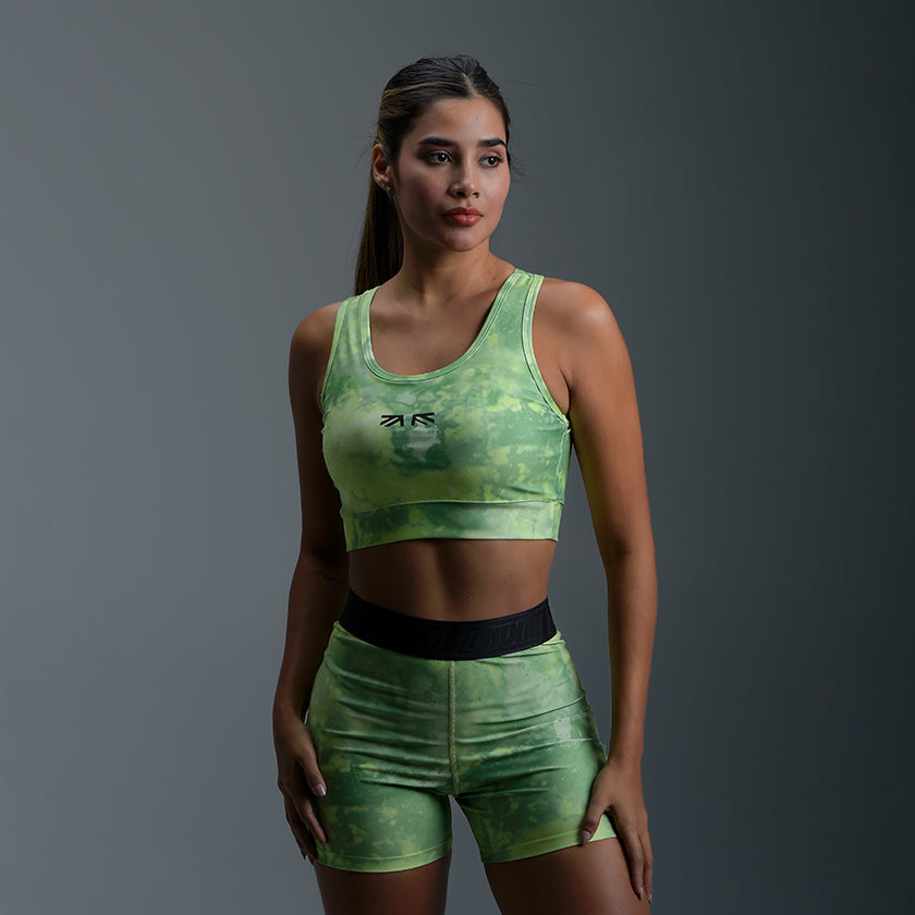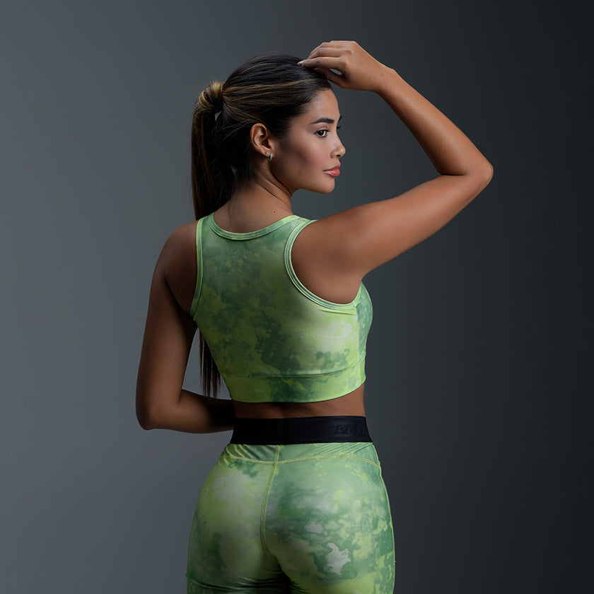 Top deportivo para mujer luce logo bandera estampado en el pecho.