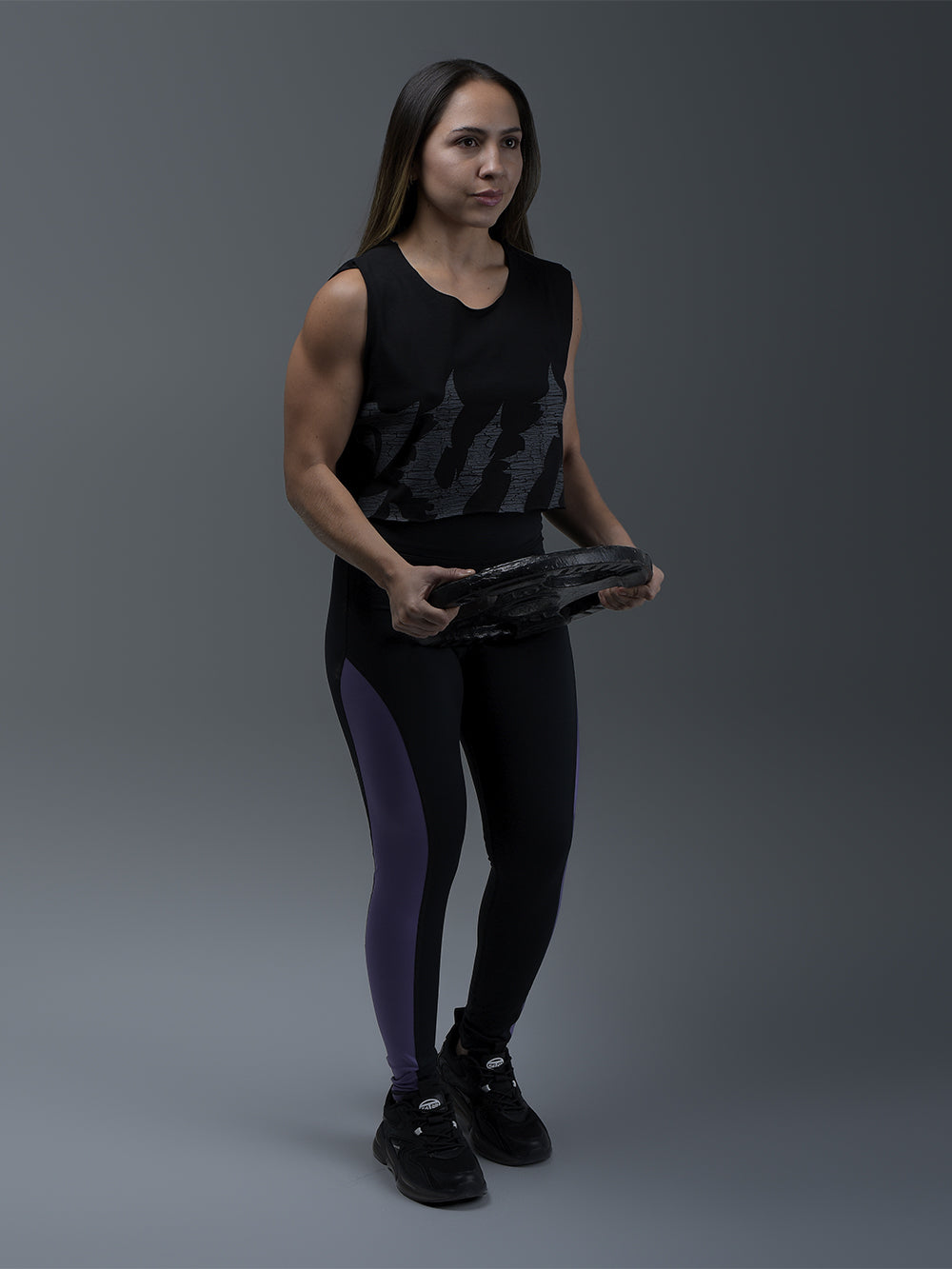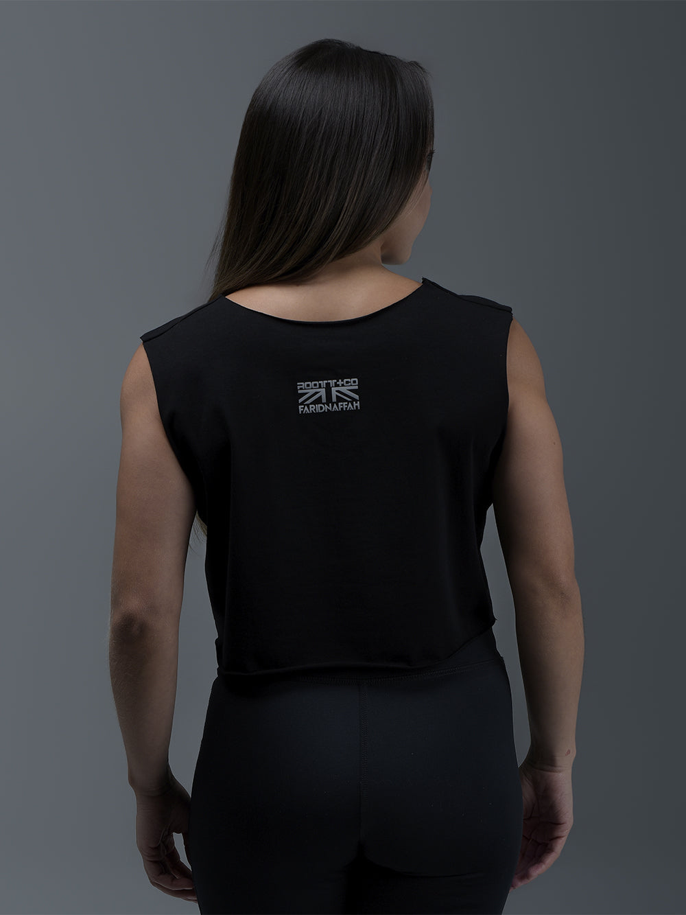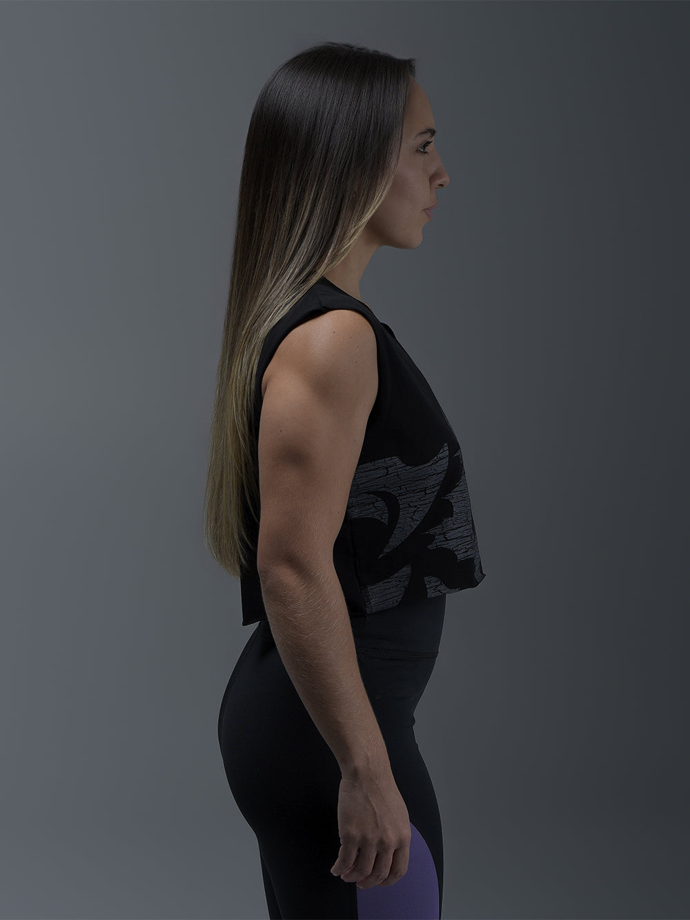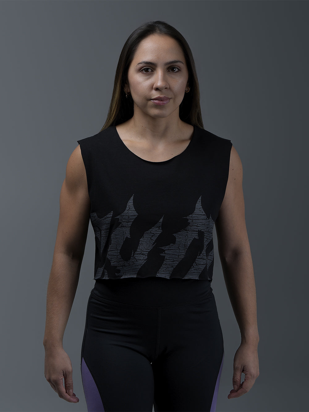 Crop Top deportivo para mujer luce gráfico frontal inferior y logo ROOTT+CO en la espalda.