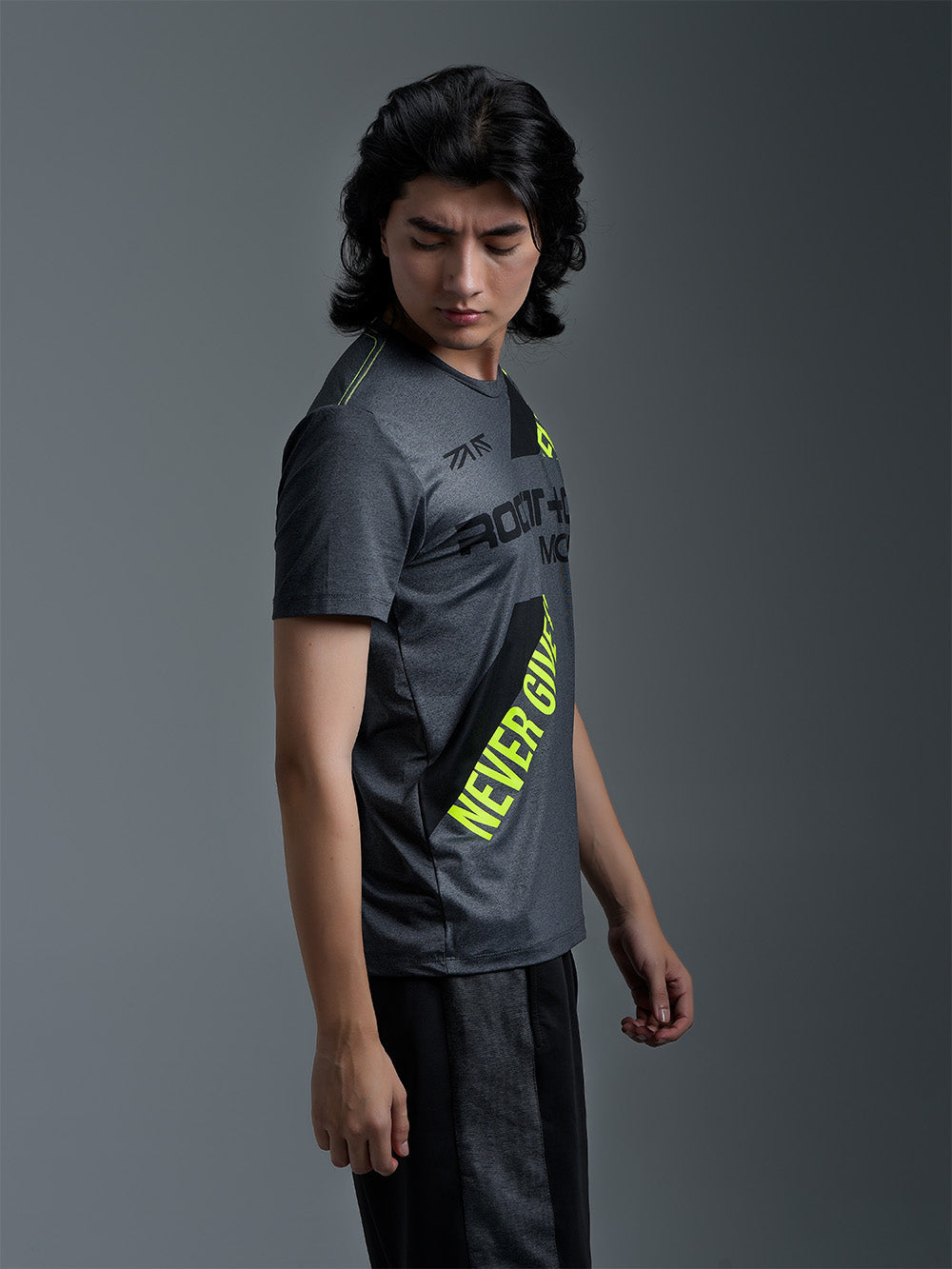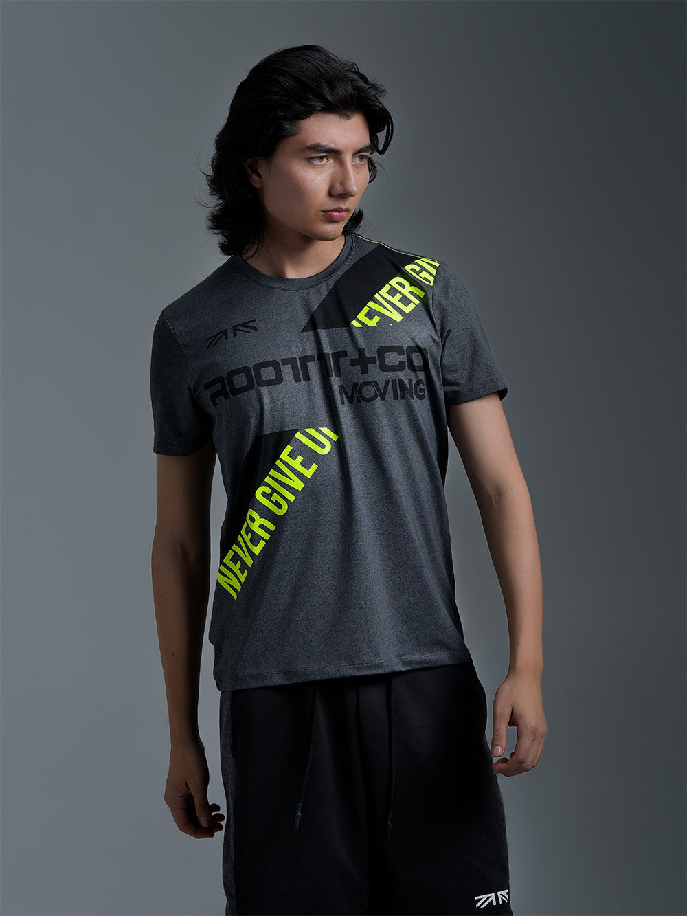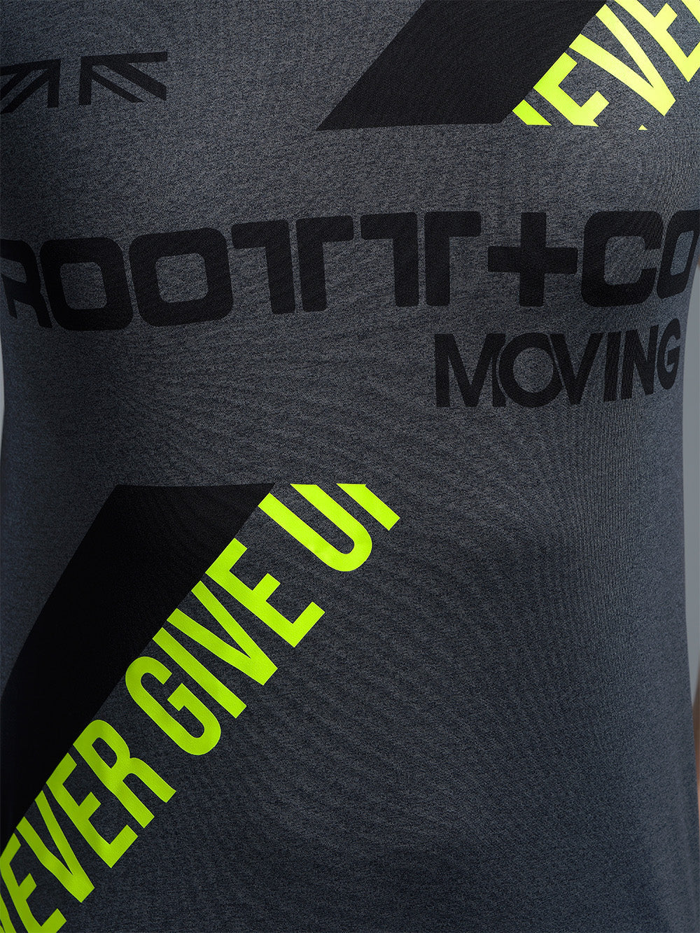 Camiseta deportiva presenta gráficos ROOTT+CO en toda la parte delantera.