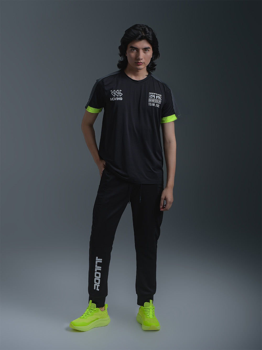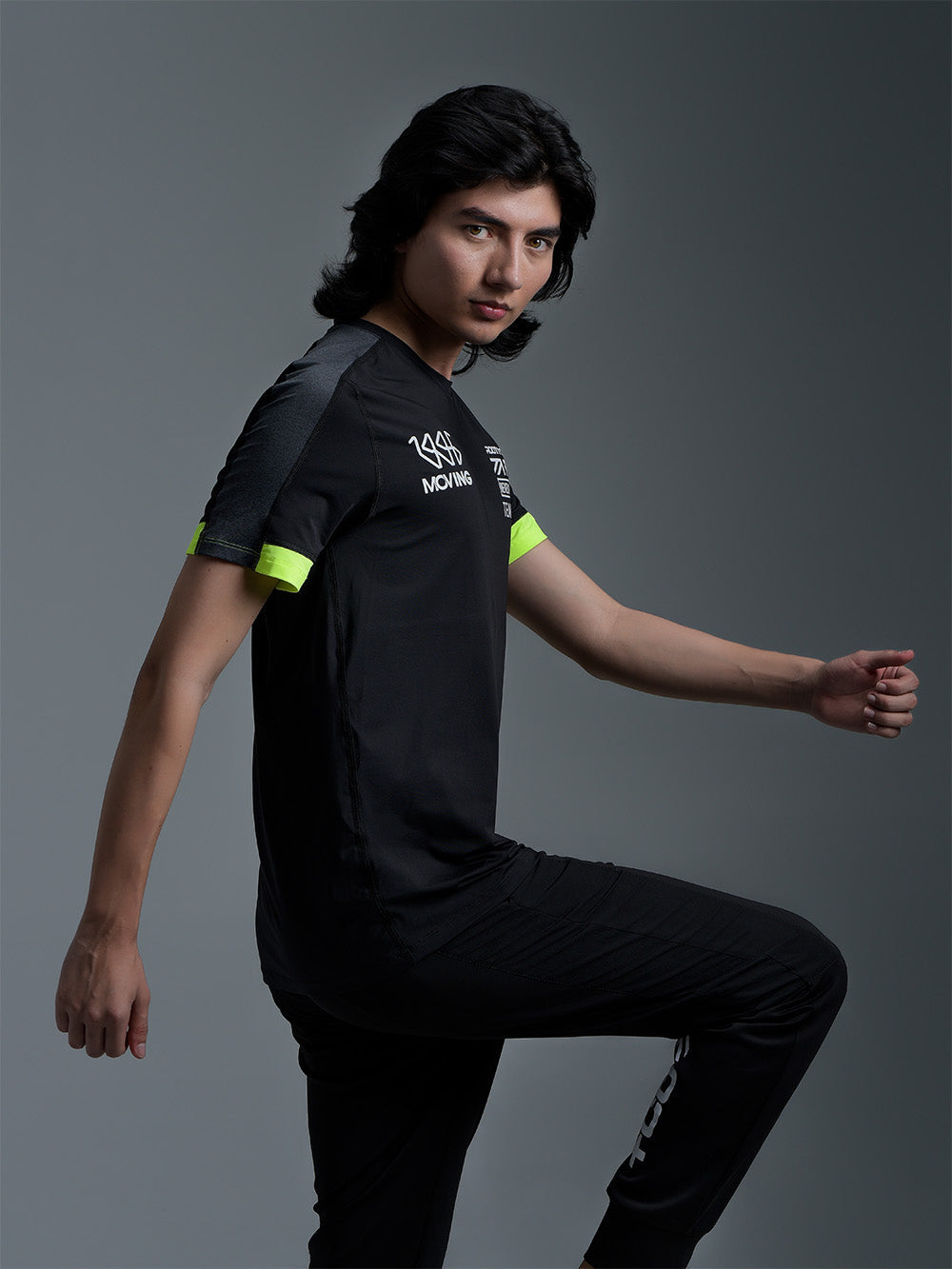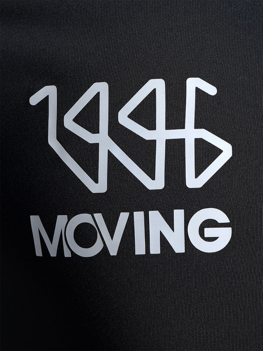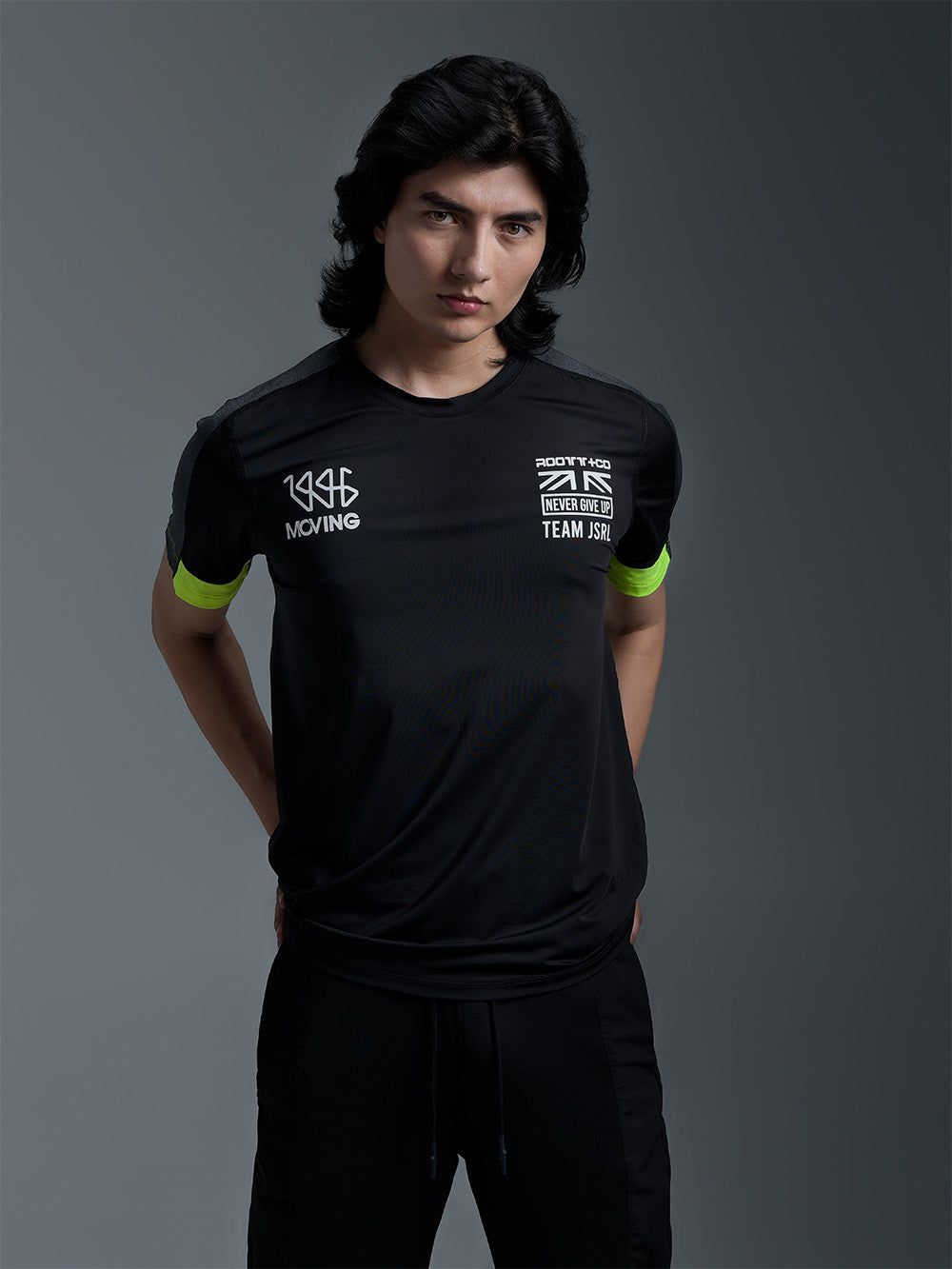 Camiseta deportiva presenta gráficos ROOTT+CO MOVING en el pecho.