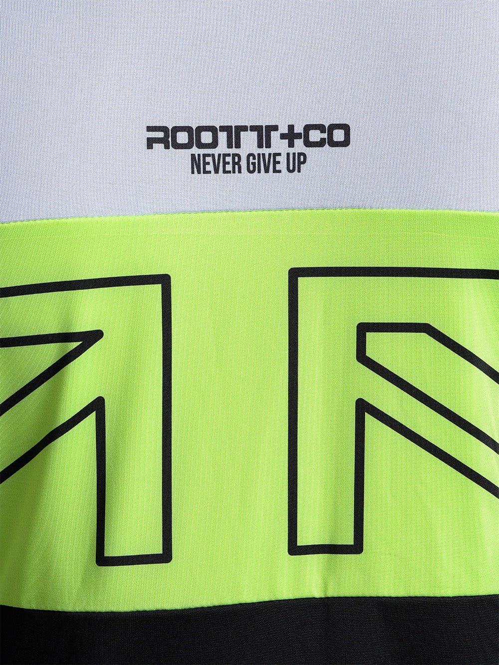 Camiseta deportiva presenta gráfico bandera ROOTT+CO en el pecho.