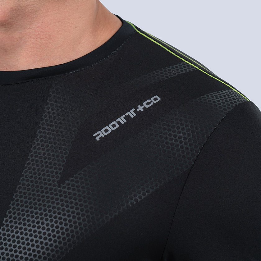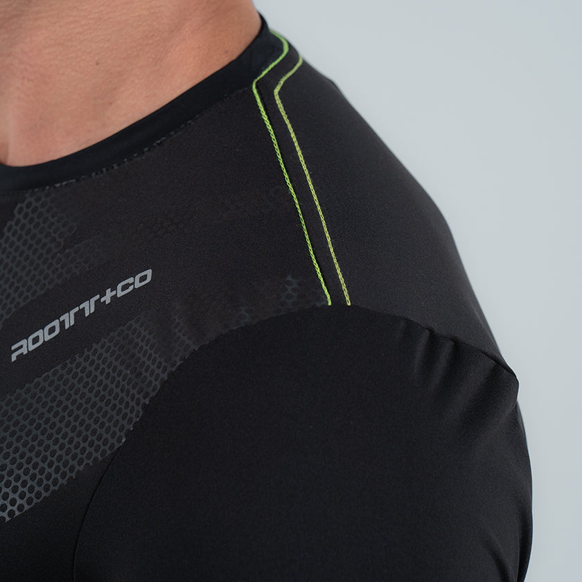Camiseta para hombre. Presenta pequeño estampado en el pecho, diseño grafico en la espalda y marquillas banderilla ROOTT+CO.
